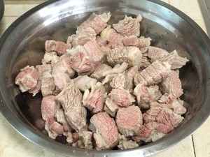 牛腩切块,4cm左右大小,不能太小煮后会回缩。泡水30分钟,去除多余血水。