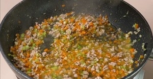 把胡萝卜切成小丁,芹菜切成小丁,葱姜蒜切末,猪肉剁成肉末